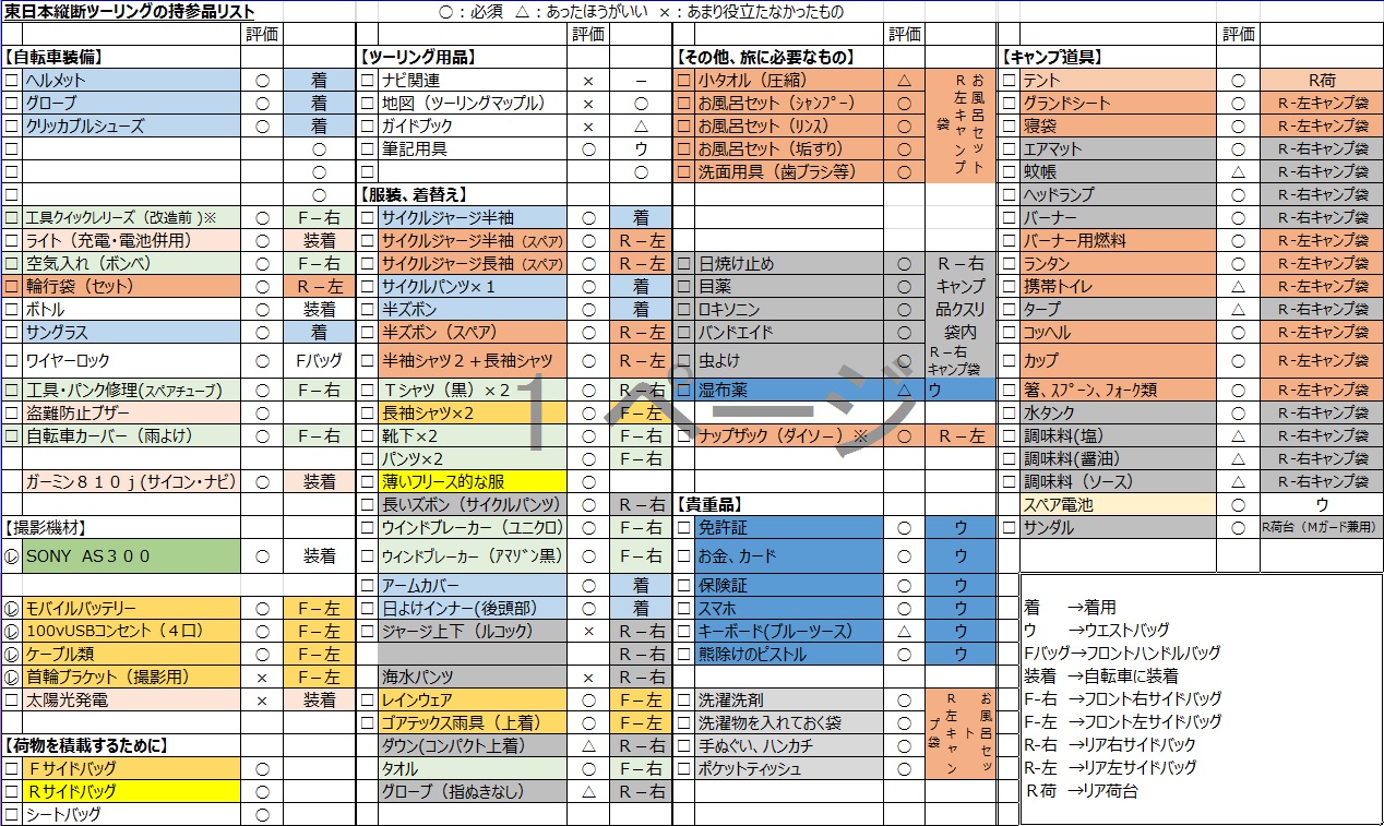 後記 ゴール翌日早朝の特急で稚内を発ち、特急を乗り継ぎ新幹線で東京まで、22時に自宅に戻った。帰りの新幹線のなかで、今回の旅行を総括してみた。 ●今回の旅は、46年前の高校3年の夏休みに鹿児島から東京まで自転車での縦走が終わったとき、いずれ東京から宗谷岬まで走りたいとの思いがきっかけだった。時は過ぎ、この思いを40年後の退職時期が近づいたころ思い出す。ひとまず、無駄に太った95kgの体を絞り75kgまで落としたところで、安いロードバイクを購入。(これを今回のキャンピング仕様に改造。) ●脚力強化のために、近隣のサイクリングロードをまめに走り、併せて映像を撮ってYouTubeにアップすることにはまる。試しに東京ー直江津間を1日で走行したりして自分の脚力レベルをアップし、必要な備品をAmazonでポツポツと購入を始める。(資金は、現役時代にこつこつ貯めたへそくりから) ●40年以上勤めた会社を退職後、別途雇用していただいた会社で3年がすぎる頃、どんなに鍛えても落ちていく体力にビビり、東日本縦断サイクリング決行を決断、かみさんに旅の計画を打ち明け、本年5月末に退職。(①旅から帰ったら、再就職を目指すこと、②かみさんに現在位置が確認できるよう、スマホに位置情報ソフトをインストすることを条件でしぶしぶ了承、8月実行が決定。) ●旅に使用する自転車は、グレートジャーニーのような本格的な自転車購入も考えたが、今でも狭い自転車置き場(現在3台+かみさん1台)にもう一台を増やすことが難しいことから、フロントギア3枚に未練を残しつつ最初に購入した安価なロードバイクを改装・改造することとした。この、ロードバイクは、許容荷重が90kg、体重は75kgなので15kgの積載が可能だが、5kgオーバーの20kgの積載となってしまった。(メーカーの安全率がこれをカバーしていることを信じて、この積載で決行する事にした。) ●8月18日に荒川河口0kmポストから出発。コースは、Google でマイマップを作成し極力平坦なコースで日本海側を北上することとした。それでも、群馬・新潟県境の三国峠(1,043m)を越えることとなり、重たい自転車での峠越えは、今までにない苦痛を味わった。渋川から峠まで登りに半日近くかかって頂上へたどり着いた。 ●新潟や東北地方は猛暑で、道路の温度計が40℃を超えているなど異常な状況だった。東北地方の北上は、毎日が暑さとの戦いで、水を被りながら道の駅で休憩をとりつつ走行を続けた。 ●宿は、その日のコースの勾配、自身のコンディション、気温・風向きを考慮して、昼頃に走れそうな距離を検討し決定。ただし、朝夕に雨となる予報の場合は、キャンプ場は除外。トリバコやネットの予約サイトは地方ではほとんど役立たず、グーグルで探して電話で予約することがいちばん確実だった。 ●毎日の出発は早朝とし、暑さのピークを迎える前に距離を稼ぐようにしていたが、8時にはすでに35℃近くに跳ね上がる気温に疲労は蓄積してしまうことになった。 ●新潟を走っている時は、食欲がわかず水やジュースを飲み続け吐き気が消えない状況が続いていた。新潟のキャンプ場では、テントを設営し中で横になったところ倦怠感と吐き気が襲い、全く体が動かなくなった。この日は、キャンプ場まで走行距離が140Km程度となり、炎天下の走行も長かったことから夕方になって状態が悪くなったものと思われる。管理棟で購入した2本のジュースを脇に当て、濡らしたタオルを首に巻き、熱さましシートをおでこに貼って2時間ほど安静にしていたところ、吐き気と倦怠感がなくなった。夕食用のコンビニの冷たいうどんものどを通ったことから、この日はそのまま安静にしていた。翌日は、大事をとって50km程度で切り上げ、瀬波温泉の宿に逃げ込み、クーラーの下でゆっくり休息した。 ●瀬波温泉の宿を朝早く出発し、体調を確認しながらほぼ20Kmごとにある道の駅で休憩を取りながら先に進んだ。 ●このころから、お昼はがっつり食べ、朝夕は簡単にすまし、宿は素泊まりとし、経費削減も図った。旅の途中から体にかゆみを感じるようになったので、野菜ジュースをコンビニで購入し毎日飲んでいたところかゆみは止まった。 ●秋田市に到達する頃に、台風20号がやってきたので一泊素泊まり3000円のビジネス旅館に二泊し、体を休めつつ台風をやり過ごすこととした。このころ、リアのディレイラーがカチッと入らない状況がひどくなっていたので、雨が強くなる前に市内の自転車さんに見てもらい、クイックハブがちゃんとセットされていなかった状態の修復や、再調整をしてもらい、以降最後まで快調に使用できた。 ●この頃には、重い自転車の走らせ方のこつも掴み、100km程度なら翌日に疲労も残らないようになっていた。このため、秋田八森から一気に青森まで走り、夜には函館に上陸できるなど順調な走行ができるようになっていた。 ●ところが、北海道に入ってからは気温の低さと雨にたたられ、雨具の下で蒸れたから